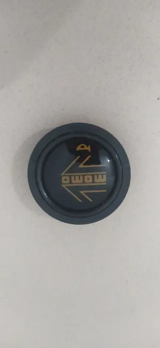 Claxon de la marca Momo. Diseño circular con detalles en dorado. - Logo de Momo. - Flechas indicadoras.