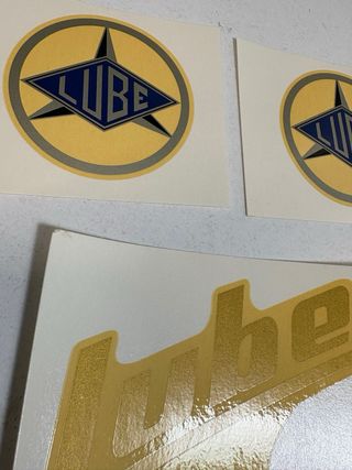 Tres calcas al agua de la marca LUBE, LUBE REEN Nuevas para modelos de motos clásicas LUBE - Incluye dos calcas circulares con el logo LUBE. - Incluye una calca grande con el texto LUBE Renn. - Calcas con acabado dorado y detalles en azul y negro