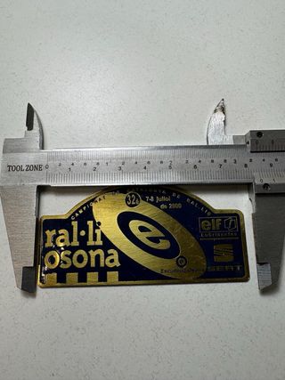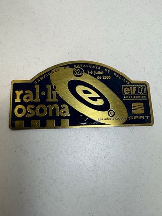 Chapa conmemorativa del Rally Osona de 2000. - Diseño ovalado con el logo de Seat y Elf Lubricantes. - Incluye texto '32è Campionat de Catalunya de Ral·lis' y 'Escuderia Osona'. - Fecha: 7-8 de julio de 2000.