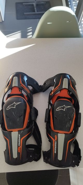 Rodilleras ortopédicas Alpinestars B2-Carbon. - Diseño en color negro y naranja. - Incluye el logo de KTM Powerwear. Talla L-XL,l. Almohadillas de recambio para el ajuste sin usasr,y topes de extensores sin usar.Tienen algún roce del uso.