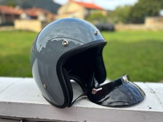 Casco de moto estilo retro en color gris brillante. Incluye visera desmontable con corchetes . - Exterior liso y brillante. - Borde negro. - Cierre de seguridad. - Talla L
