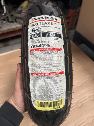 Rueda trasera Bridgestone Battlax SC. - Medida: 120/90-10 - Índice de carga: 66J - Tipo: Tubeless (sin cámara) - Indicada para uso trasero. Cubierta sonic,aprilia,jogr,bws.....