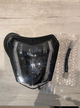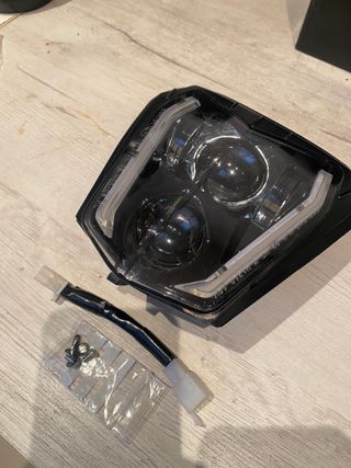 Foco LED para KTM 690, Husqvarna 701 y GasGas 700. Con homologación ECE. DRL Xdure Datos técnicos: intensidad luminosa 36 W – 2200 lm luz de cruce, 66 W – 4000 lm luz larga, 6 W – 200 lm DRL / color de luz aprox. 6.500 Kelvin. - Incluye cableado y tornillería para su instalación.