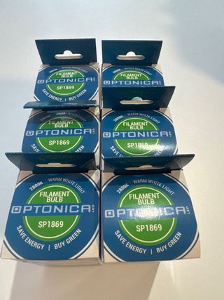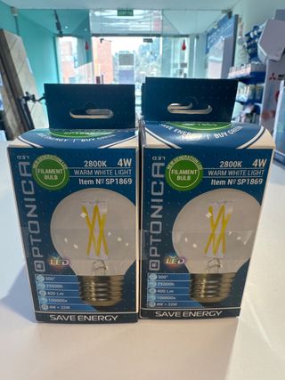 6 bombillas LED de filamento de la marca Optonica, modelo SP1869. Son de luz blanca cálida y bajo consumo. - Potencia: 4W (equivalente a 32W tradicionales). - Casquillo: E27. - Temperatura de color: 2800K. - Flujo luminoso: 400 Lm. - Vida útil: 25000 horas. - Ángulo de luz: 300°.