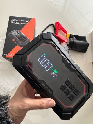 Arrancador de batería para coche BSMOOM con compresor de aire. - Potencia de 7500 A. - Diseño robusto y compacto. - Pantalla digital. - Incluye pinzas y cables. BSMOOM Arrancador de batería 7500 A (para todos los gases y diésel de 10 L), con bomba de aire de 150 PSI, banco de energía portátil con luz LED, bomba de aire inteligente inalámbrica a batería, con pantalla LCD. Nuevo sin estrenar.