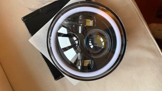 Foco auxiliar para motocicleta con un distintivo aro de luz LED en color amarillo. Ideal para mejorar la visibilidad en condiciones de poca luz. - Diseño moderno y llamativo. - Aro de luz LED amarillo. - Cableado para conexión.