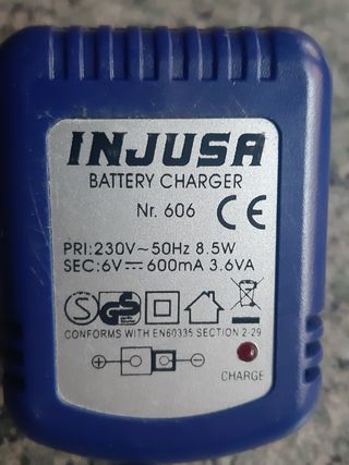 Cargador de baterías de 6 voltios.marca Injusa.y con la potencia que indica en etiqueta.esta prácticamente nuevo.con luz de verificación.de carga.
