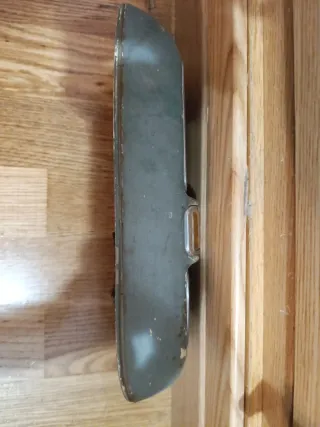 Piloto trasero "Hella F R" de los años 50. Pieza de recambio para vehículos clásicos y y tractores alemanes o industriales. Dkw, lanz, deutz, auto union... Las lentes que se ven negras son rojas, pero se ven al aplicarles luz por dentro. - Diseño ovalado. - Lente ámbar central. - Carcasa en color verde grisáceo.