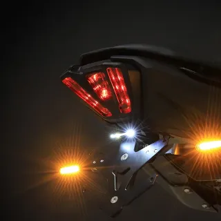 Guardabarros trasero para motocicleta, con luces integradas. - Luz trasera roja ovalada. - Intermitentes naranjas a los lados. - Reflector rojo inferior.