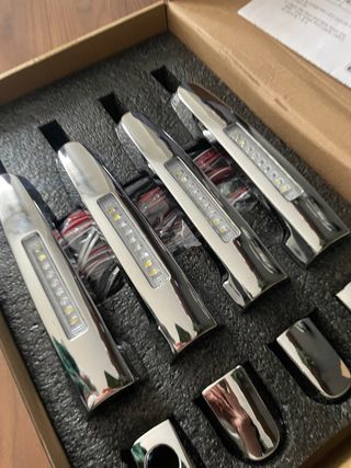 Manetas / manijas / manillar exteriores cromadas para coche Toyota Probox, Succed, Hilux Vigo, Corolla con luz led. Ha sido un regalo de mis padres pero se han equivocado y yo no tengo un Toyota, así que está en la caja sin estrenar. Creo que son de Aliexpress y me han dicho que les ha costado unos 120€, así que bueno, lo pongo a 50€ para recuperar un poco