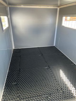 Carro para transporte de perros con sus papeles - Suelo de goma antideslizante con vaciado de liquidos. Desmontable para facil lavado, - Paredes y techo con aislantes. - Ventanas a cada lado con opción de cierre. - Lleva rueda de repuesto y luz en el interior.