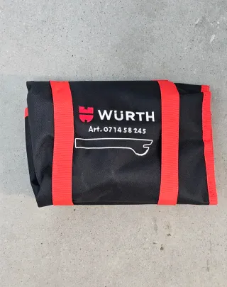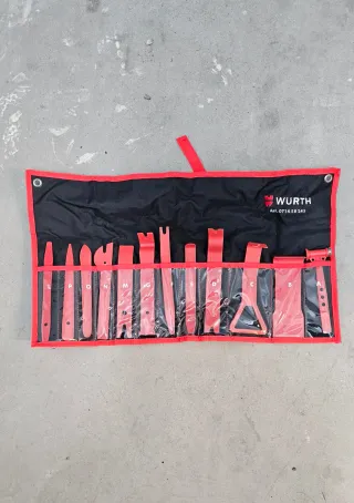 Set de herramientas para desmontaje de interiores de coche. - Incluye varias palancas de plástico rojo. - Marca: Wurth. - Se presenta en un estuche enrollable negro con ribete rojo.