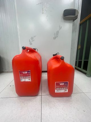 Garrafa de plástico naranja para combustible. Tiene un asa para facilitar su transporte y un tapón de seguridad. , son Homologadas - Capacidad: 30 L y 20 L - Material: Plástico resistente. - Color: naranja
