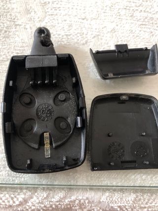Carcasa de repuesto para mando de garaje. Marca Aprimatic Zona donde se mete el llavero dañada - Pieza negra de plástico. - Incluye las dos partes de la carcasa.