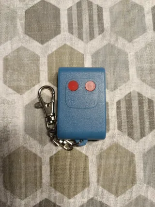 Mando a distancia para garaje modelo TX-2/7. - Frecuencia de 29,990 Mhz. - Diseño compacto en color azul. - Dos botones rojos. - Incluye cadena y mosquetón.