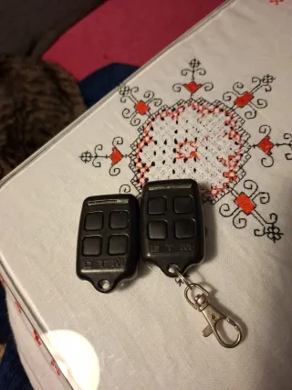 Emisor o Mando de garaje con llavero usados. Reprogramables. Precio unidad. - Mando con botón amarillo y carcasa roja, MutanCode. - Mando con botón azul y carcasa gris y azul, Mutan-II. Solo envíos. Pila incluida. Funcionando.