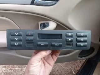 Panel de control del climatizador para BMW Serie 3 E46. - Botones para control de temperatura y ventilación. - Pantalla digital central. - Funciones de desempañado y recirculación de aire.