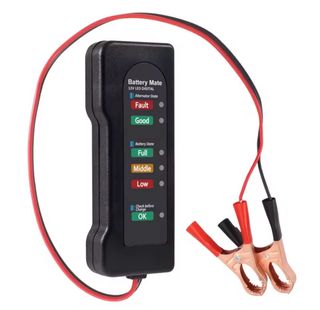 Probador de batería digital de 12V con indicadores LED. - Muestra el estado del alternador: Fallo o Bueno. - Indica el estado de la batería: Llena, Media o Baja. - Incluye función de comprobación antes de cargar: OK.