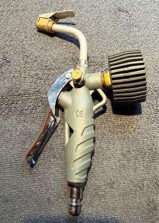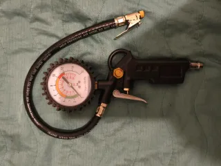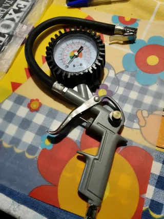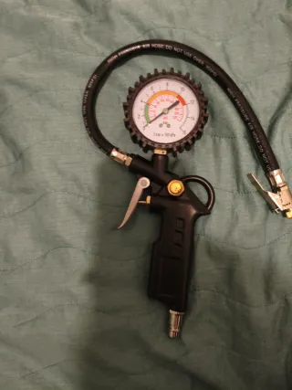 Pistola de aire neumático con manómetro integrado para medir la presión. - Manómetro con escala en PSI y BAR. - Gatillo ergonómico para un mejor control. - Manguera flexible para mayor alcance.