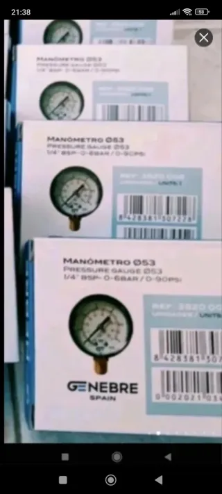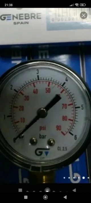 Manómetro de presión marca Genebre, modelo 053. - Rango de medición: 0-6 BAR / 0-90 PSI. - Conexión: 1/4 BSP. - Fabricado en España. por liquidación stock nuevos para saber la presión de agua ideal ósmosis fontanería regulador presión filtro piscina medidas y características en foto 1 unidad 5€ 10 unidades 40€ disponemos material ferretería fontanería electricidad accesorios recambios ósmosis cerradura manetas manilla manillon pomo antenas repartidor distribución PVC mecanismos Simón válvulas desagües marca roca material ferretería liquidación