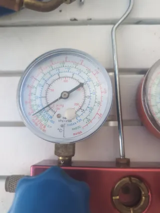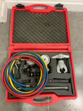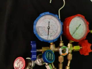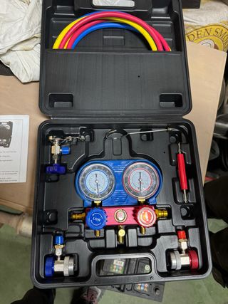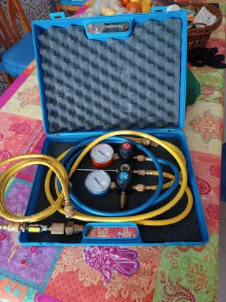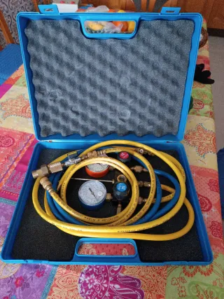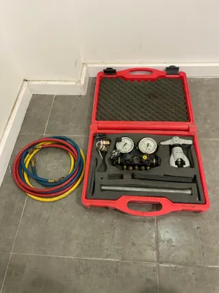 Kit de manómetros para aire acondicionado. - Incluye mangueras de carga de colores (rojo, azul, amarillo). - Maletín rojo con interior de espuma para protección. - Dos manómetros con escalas. - Válvulas y acoples.