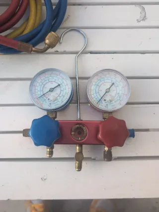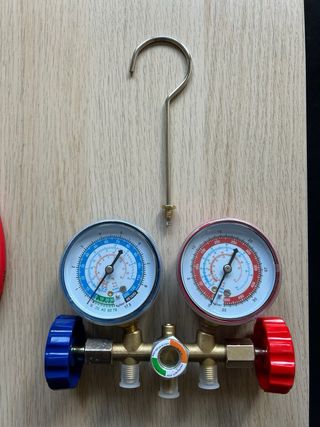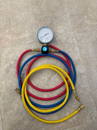 Manómetro para medir la presión de gas. Incluye mangueras de colores para facilitar la conexión. - Dos manómetros (rojo y azul). - Mangueras de conexión (roja, azul y amarilla). - Válvulas de control (roja y azul). - Gancho para colgar.