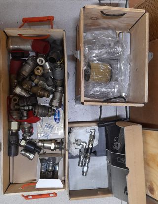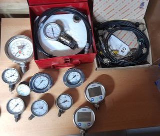 Conjunto de manómetros y accesorios para sistemas hidráulicos. - Incluye varios manómetros de diferentes rangos. - Accesorios de conexión Minimax y mangueras. - dos manómetros digitales WIKA. -racores, adaptadores