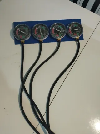 Set de 4 manómetros de vacío para carburador, montados en una base azul. - Incluye 4 manómetros. - Base de montaje azul. - Mangueras de conexión negras.