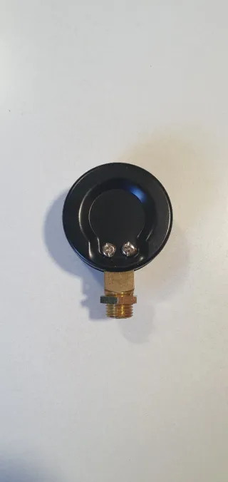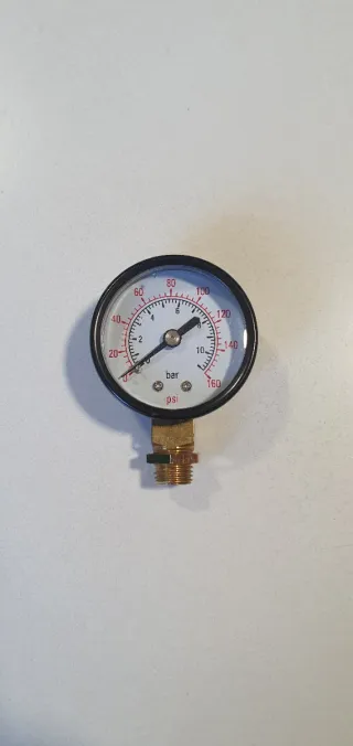 Manómetro para medir la presión. - Rango de medición: 0-160 psi. - Conexión roscada de latón. - Esfera con marcas en psi y bar.