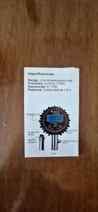 Manómetro para medir la presión de los neumáticos de tu vehículo. Es una herramienta útil para el mantenimiento. - Diseño compacto y fácil de usar. - Muestra la presión en diferentes unidades.