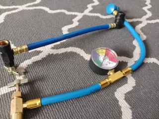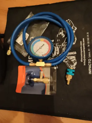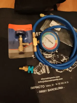 Kit de manómetro para recarga de aire acondicionado. Igualmente recarga el calefactor muy importante si no no funciona en en invierno tampoco incluye válvula de apertura nueva a estrenar en su caja el adaptador de conexión rápida y lo que consta aquí abajo 640 82 83 60 también WhatsApp - Incluye manguera azul. - Adaptador de conexión rápida. - Válvula de control CT-341.
