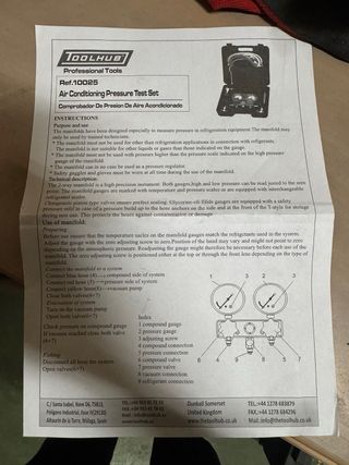 Set de manómetros para sistemas de aire acondicionado. Incluye todo lo necesario para su uso. - Maletín de transporte resistente. - Diseño compacto y duradero.