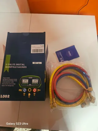 Manómetro digital de 2 válvulas MR CARTOOL L302 para aire acondicionado. - Modos: Presión de refrigerante,del aire acondicionado porcentaje de refrigerante, detección de fugas. - Válvula de bola manual. - Incorpora 90 refrigerantes. Producto nuevo