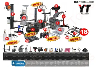EN STOCK DISPONIBLE.Kit completo de herramientas para taller mecánico, compuesto por 18 piezas esenciales. - Elevador de 2 columnas (41, 220V). - Desmontadora de ruedas (11-24). - Equilibradora de ruedas (11-24). - Recogedor de aceite (Aspira, Recoge). - Gato de foso (500kg). - Pistola de impacto (1450mm, 1/2). - Compresor de aire (220V, 4hp). - Manguera de aire (Enrollada, 15m). - Aceite hidráulico (SL 10L). - Gato carretilla (31,2). - Contrapesos y válvulas. - Reposicionador para pistones de freno. - Sangrador de frenos (Completo por vacío). - Pistola de inflado (Manómetro 10bar). - Accesorios de equilibrado IVA+ENVIO APARTE DEL