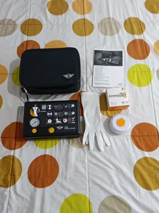 Kit de movilidad MINI que incluye un sistema antipinchazos y una baliza v16 geolocalizada. - Bolsa de transporte negra con logo MINI. - Inflador de neumáticos con manómetro. - Guantes blancos de protección. - Caja de EmergiLight. - Baliza v16 con botón naranja.
