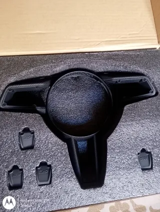 Embellecedor para el volante de un Porsche. Pieza de plástico negro con diseño de panal en la parte superior.es una cubierta embellecedora de volante para modelos Porsche como el 911 992 GT3, Panamera, Taycan, Cayenne o Macan. - Material: Plástico. - Color: Negro. - Diseño: Panal.
