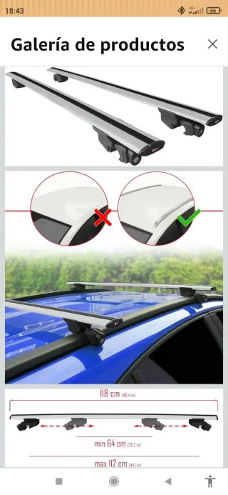 Barras de techo universales para coche. Se ajustan a diferentes vehículos. - Longitud: 118 cm (46.4 in). - Ajuste mínimo: 64 cm (25.2 in). - Ajuste máximo: 112 cm (44.1 in). - Material: Aluminio.