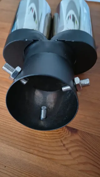 Tubo de escape doble con acabado cromado y cuerpo negro. - Doble salida. - Materiales: Acero inoxidable y metal. - Incluye tornillos de sujeción.