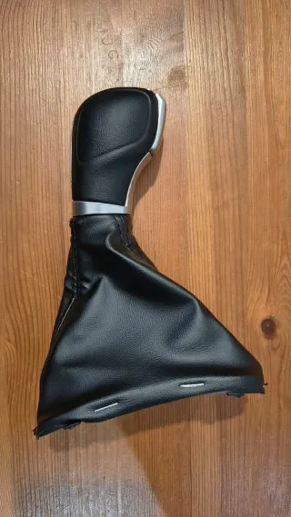 Palanca de cambio para coche con funda de cuero sintético. - Diseño ergonómico para un agarre cómodo. - Acabado plateado en la parte superior. - Funda negra con costuras visibles.