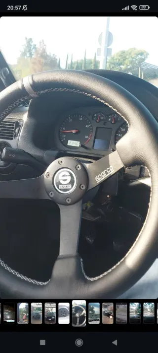 Volante deportivo Sparco. - Diseño de tres radios. - Acabado en cuero negro con costuras blancas. - Logo de Sparco en el centro.