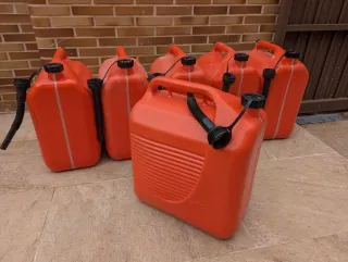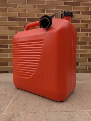 Seis garrafas de plástico de color naranja, ideales para almacenar combustible. - Material: Plástico resistente - Color: Naranja - Capacidad: 30L - Marca: Tayg