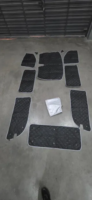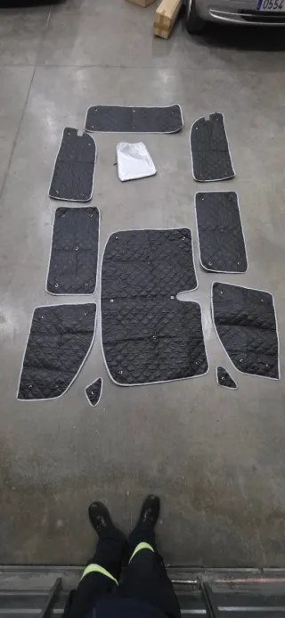 Juego de oscurecedores para Mercedes Vito/Viano W639. Válido para modelo largo y extra largo ya que son para este último pero se cosió para adaptar al modelo largo. Se quita los hilos y vale perfectamente para el extra largo. Doble puerta lateral y portón. - Material acolchado con acabado en negro. - Borde gris claro. - Incluye ojales para sujeción. -Muy muy poco uso