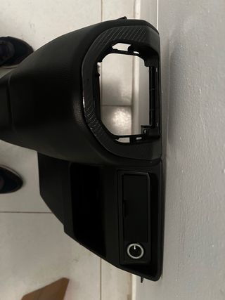 Mueble central para salpicadero de Volkswagen T6. Pieza de plástico negro y marco marchas forrado en vinilo de carbono 3d. - Compartimento con bandeja. - Conector tipo mechero.