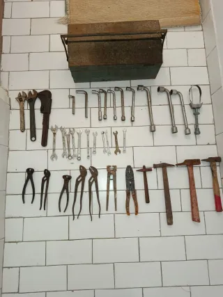 Conjunto variado de herramientas manuales, incluyendo llaves de diferentes tipos y alicates.llqves americana 9 11 18 12-13 6-7 6-7 12-13 12-10 13-14 otro llaves13 19 19 11 18 12 11 8 como ves algunos repetidos con la caja - Variedad de llaves de vaso y fijas. - Alicates de corte y presión. - Martillos de diferentes tamaños. - Llave de filtro de aceite.