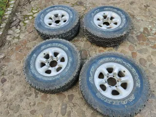 Juego de 4 llantas de Mitsubishi montero v20 con neumáticos mixtos Maxxis A/T worm Drive 31/10.5/15. Medida equivalente a la original del coche. Pasa ITV sin problema y tapacubos originales . Los neumáticos tendrán poco mas de 1000 km se pusieron a mediados de 2024 Llantas en muy buen estado sin desperfectos