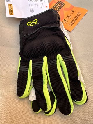 Guantes de moto de la marca Moore, talla L y homologados. - Diseño en negro con detalles en amarillo neón. - Cierre de velcro en la muñeca. - Materiales resistentes.
