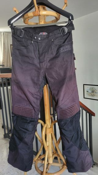 Pantalón de moto, fabricado en Cordura, negro. Marca EVOLUTION Talla M. Mido 1,73 y 76 Kg y constitución normal. Usado, bien conservado. - Muy resistente al agua y al frio. - Cinturón ajustable. - Protecciones homologadas en rodillas, extraíbles - 2 bolsillos. - Cierre ajustable en los bajos con cremallera. - Forro térmico desmontable - Dos Cremalleras para unión chaqueta-pantalón