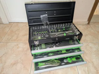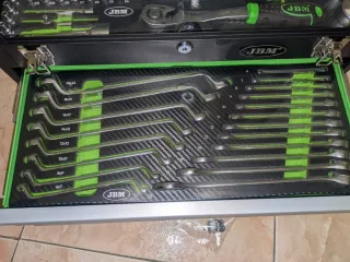 Completa caja de herramientas JBM con múltiples compartimentos y herramientas. - Diseño robusto en color negro y verde. - Cajones extraíbles con organizadores. - Incluye llaves, vasos y accesorios.
