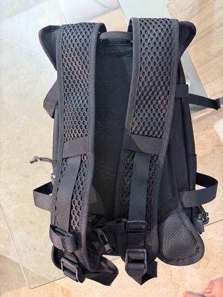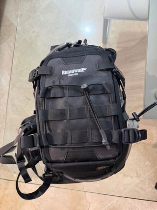 Mochila o bolsa sobre depósito de la marca Rhinowalk. - Color negro. - Diseño con múltiples correas y compartimentos. -Bolsa de hidratación de 1.5 Litros , le falta la parte de goma Muy poco uso, trae funda impermeable integrada