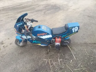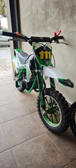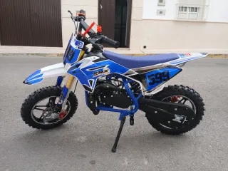 Minicros de 49cc, ideal para iniciarse en el mundo del motocross. - Tres posiciones de velocidad en el acelerador para enseñar a los mas pequeños. - Sistema de seguridad hombre al agua. -Varias mejoras como mangueras de gasolina, grifo de paso de gasolina nuevo mejorado, carburador del 12mm dellhorto para mejor aceleración. - la moto está bastante nueva se aprecia en la ruedas, se ha usado unas cuantas veces. # Tiene hecha un apuesta apunto, lista para rodar ya. El niño no quiere usarla.